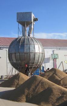 3、在烘干過程中,稻谷緩慢下落由頂部風(fēng)機(jī)將稻谷從烘干機(jī)底部循環(huán)提入料風(fēng)分離器,再由鎖風(fēng)料管自然落入大球體內(nèi),球體內(nèi)稻谷在勻速運(yùn)動(dòng)中被烘干。